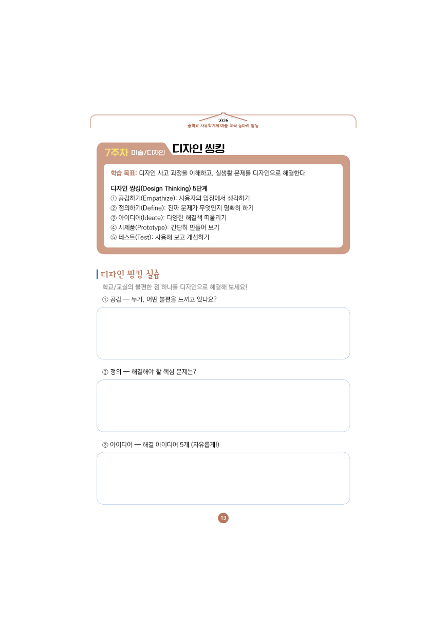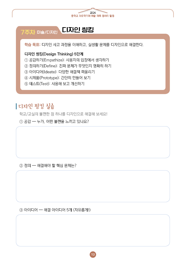 이전글 다음글 목록 본문 학교인쇄통(school-tong.com) 7주차 미술/디자인-디자인 씽킹 규격 16절(190*260) A4(210*297) 표지코팅 4도컬러 유광/무광코팅 표지용지 200g아트지 내지인쇄 1도 단색 출력인쇄 제본 무선제본 견적상담 상품주문안내