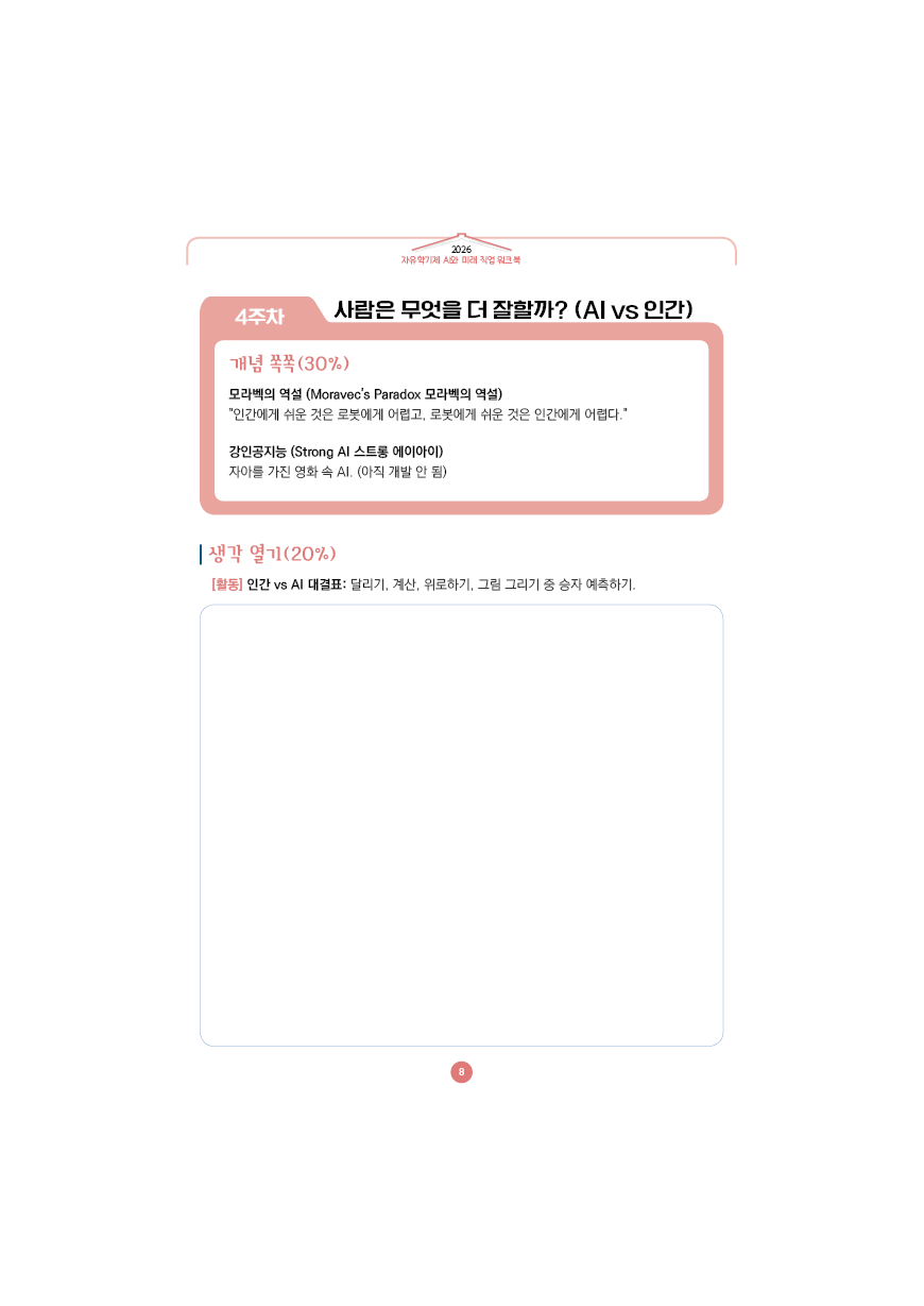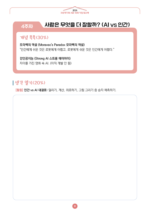 이전글 다음글 목록 본문 학교인쇄통(school-tong.com) 학교인쇄통(school-tong.com) 4주차 사람은 무엇을 더 잘할까?(AI vs 인간) 규격 16절(190*260) A4(210*297) 표지코팅 4도컬러 유광/무광코팅 표지용지 200g아트지 내지인쇄 1도 단색 출력인쇄 제본 무선제본 견적상담 상품주문안내