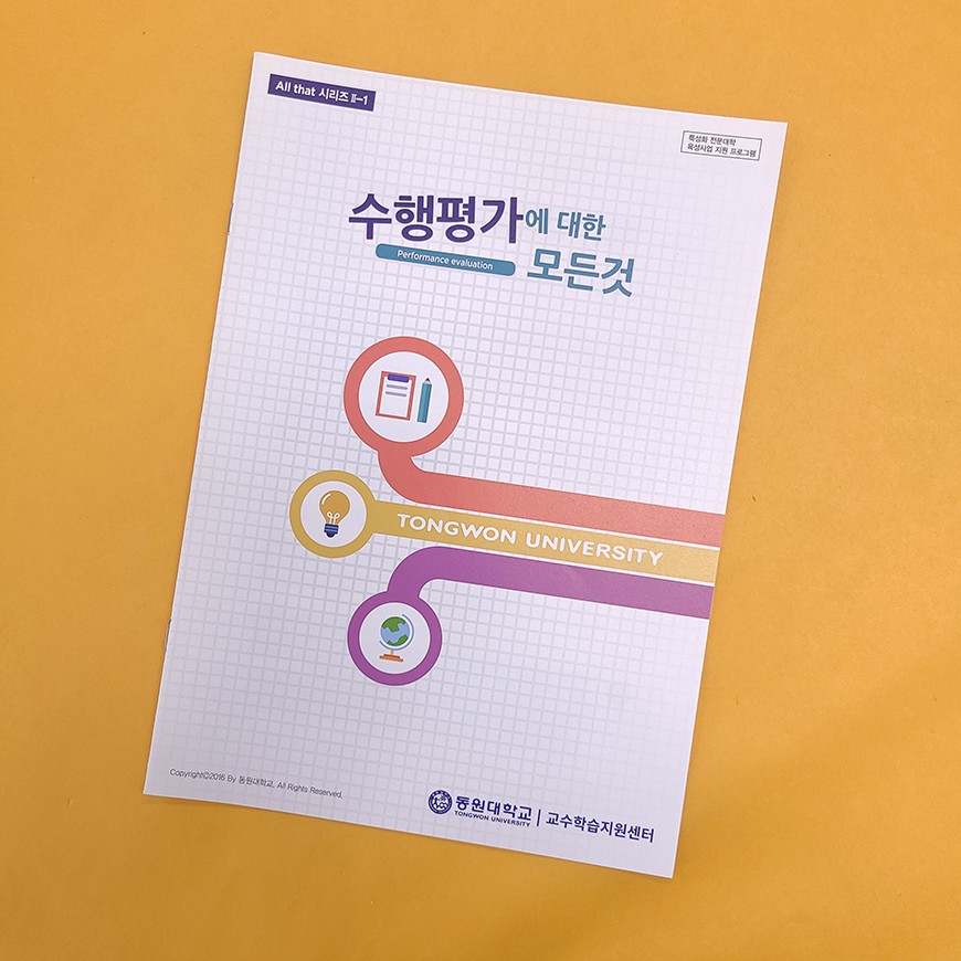 이전글 다음글 목록 본문 동원대학교 All that 시리즈 2-1 규격 16절(190*260) A4(210*297) 표지코팅 4도컬러 유광/무광코팅 용지 180g~250g스노우지/160g~210g아르떼 인쇄 4도 컬러인쇄 제본 중철제본/무선제본 견적상담 상품주문안내