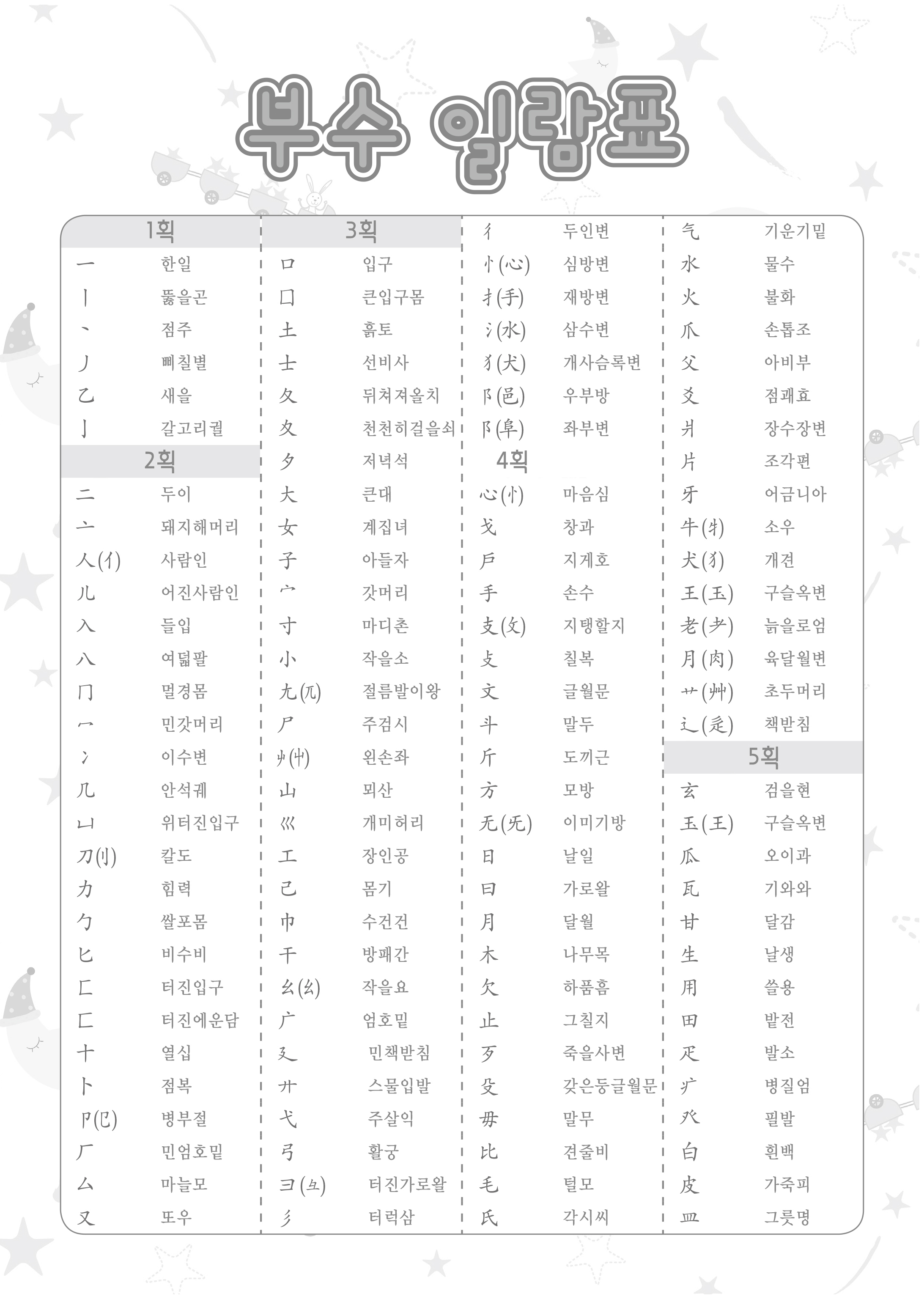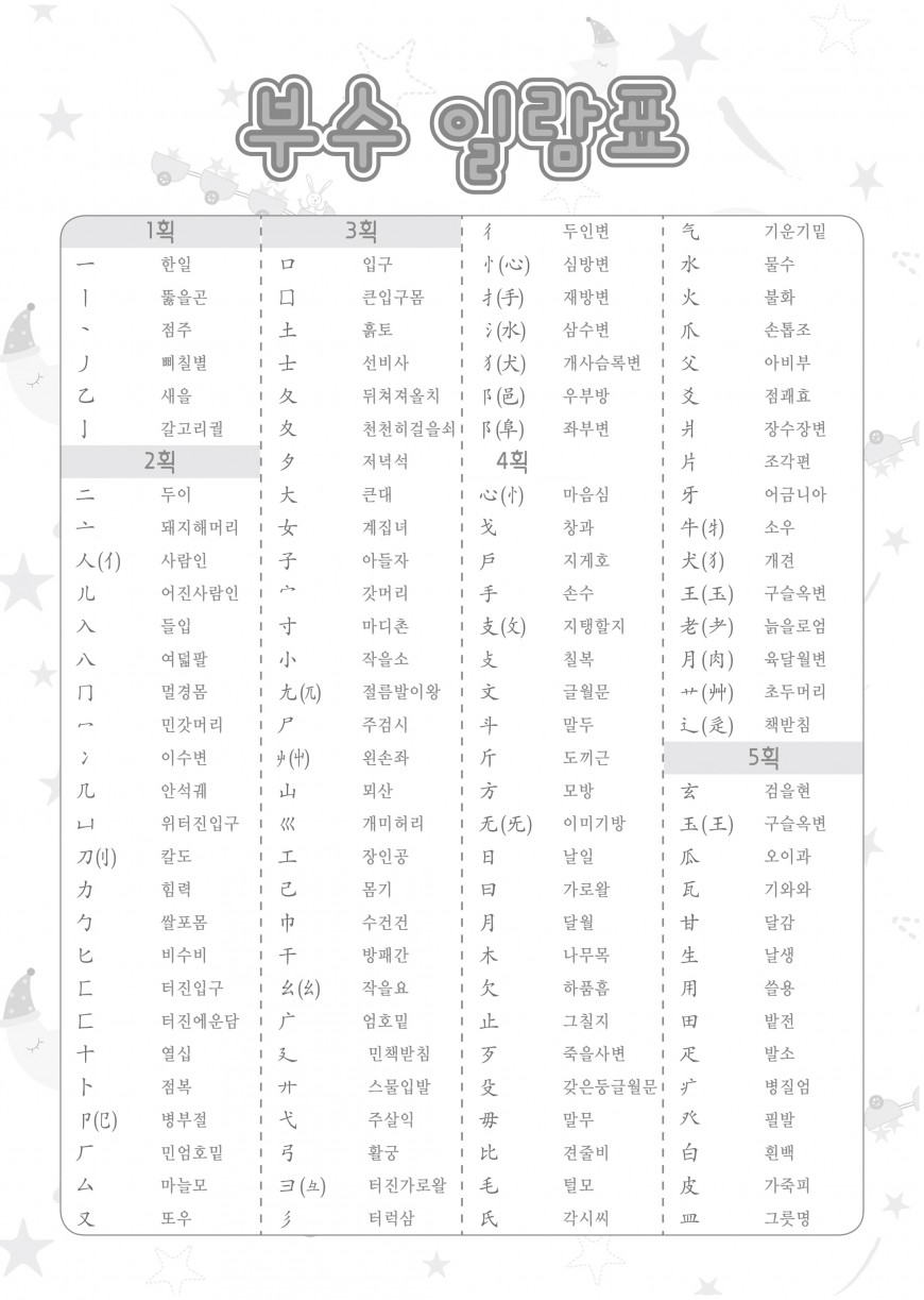 이전글 다음글 목록 본문 05_한자-부수일람표 규격 16절(190*260) A4(210*297) 표지코팅 4도컬러 유광/무광코팅 용지 80g 모조지 인쇄 4도/1도 컬러인쇄 제본 무선제본 견적상담 상품주문안내