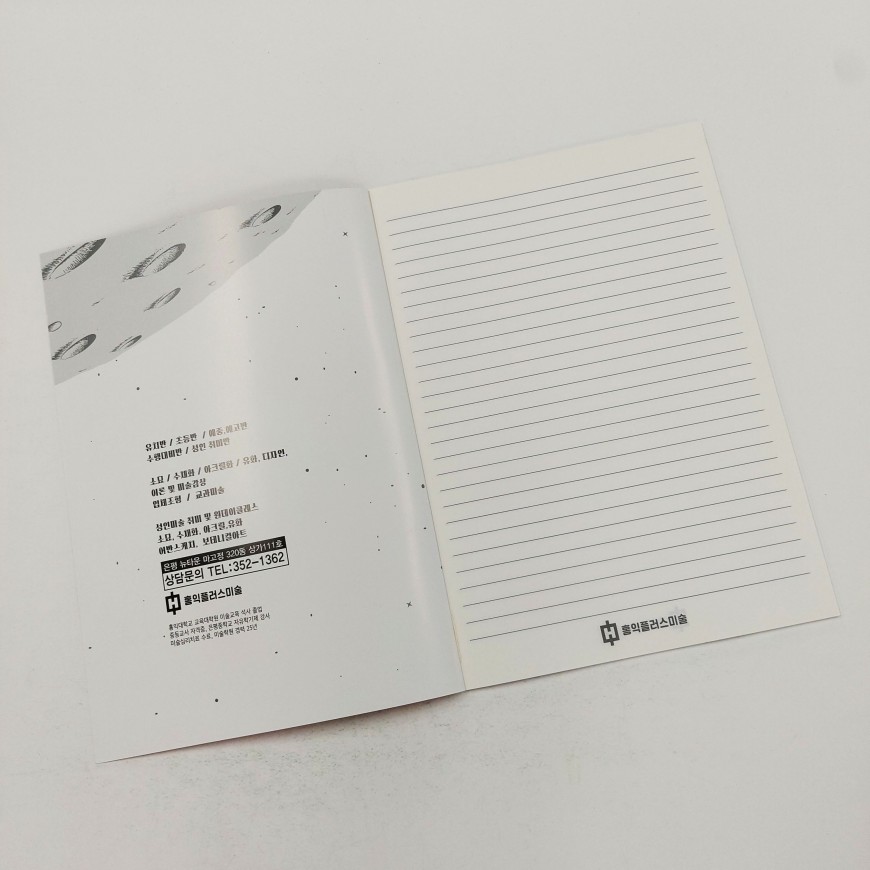 이전글 다음글 목록 본문 줄노트-126 규격 A5(147*210) 16절(185*260) A4(210*297) 표지/내지 용지 200g 아트지/80g 모조지 표지/내지 인쇄 4도인쇄/1도인쇄, 무지 선택 코팅 유광/무광코팅 선택 제본 무선제본 견적상담 상품주문안내