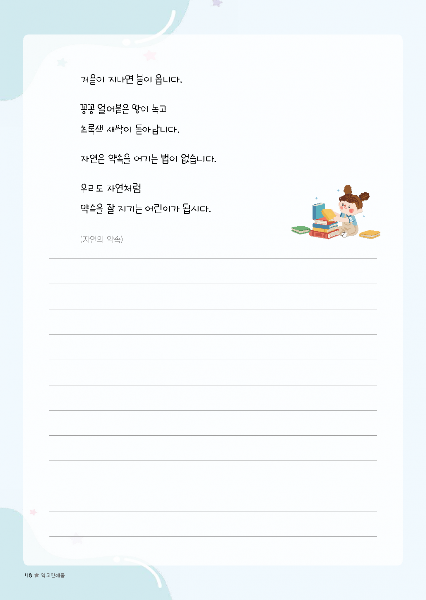 이전글 다음글 목록 본문 초등필사 저학년 내지-24 규격 A4(210*297) 표지 코팅/하드커버/싸바리 내지 80g미색모지/4도인쇄/1도인쇄 제본 스프링(트윈링)/무선제본 기타 보고고르면 완성 견적상담 상품주문안내