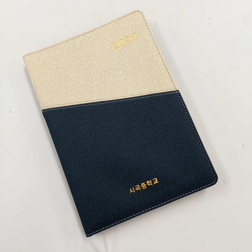 오늘 제 눈에 띈 교무수첩은 바로 시곡중학교의 교무수첩입니다. 깔끔하면서도 고급스러운 분위기가 남녀 선생님 모두가 쓰기에 부담없어 보이더라구요. 사선으로 쪼개어 아이보리와 곤색으로 디자인한 표지와 금박인쇄가 포인트로 들어가서 심플하지만 지루하지는 않은 느낌이 들더라구요. 크기는 아담하지도 크지도 않은 25절 사이즈로 제작되었어요. 25절 사이즈란 A5보다는 크고 16절 사이즈보다는 작은 크기라고 하네요.